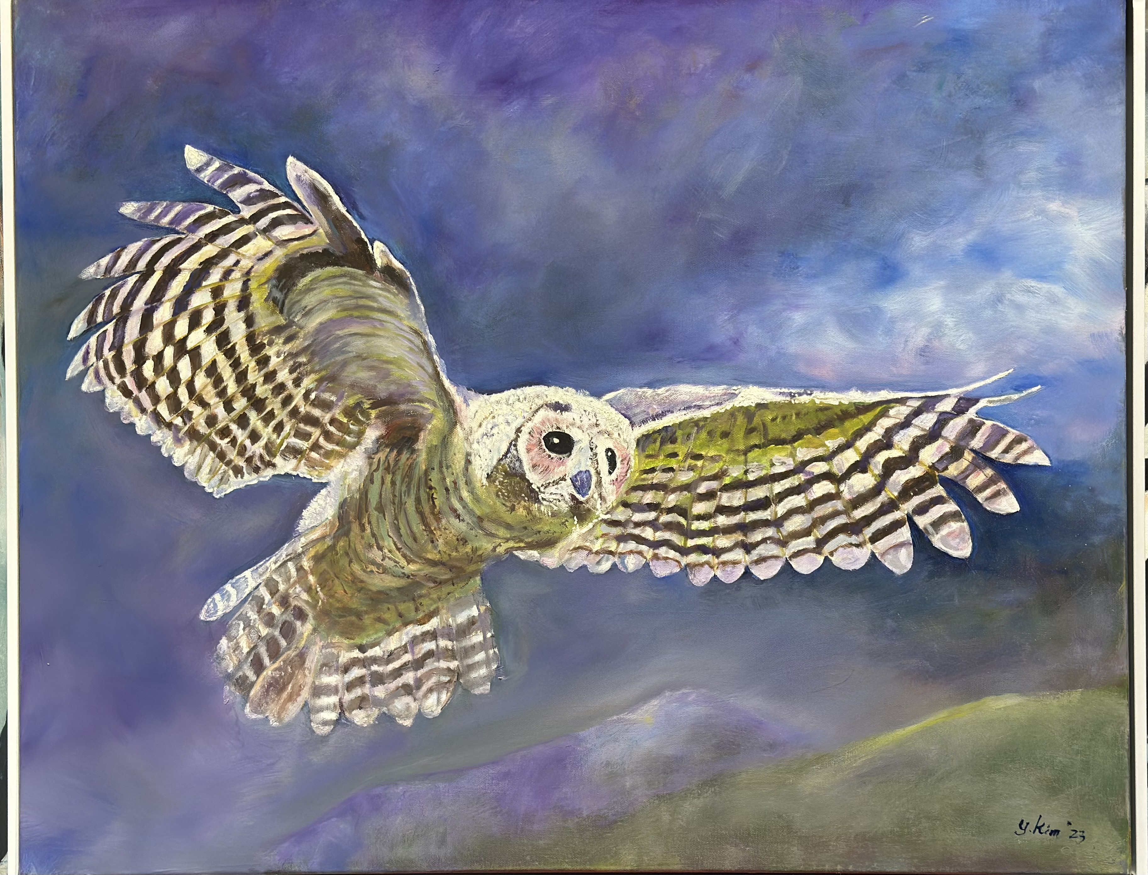 Owl at Night. Oil 20″x24″ in gold leaf frame For Gift of $1200 or more