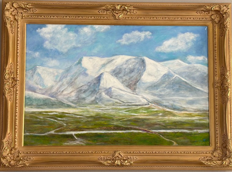 Tibet Mountains at 16,000ft high Oil 36″x24″ in gold leaf frame For Gift of $1200 or more