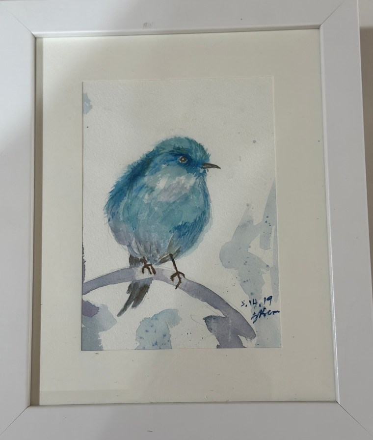 Blue Bird Watercolor 5″x7″ in 9×11″ frame for Gift of $75 or more