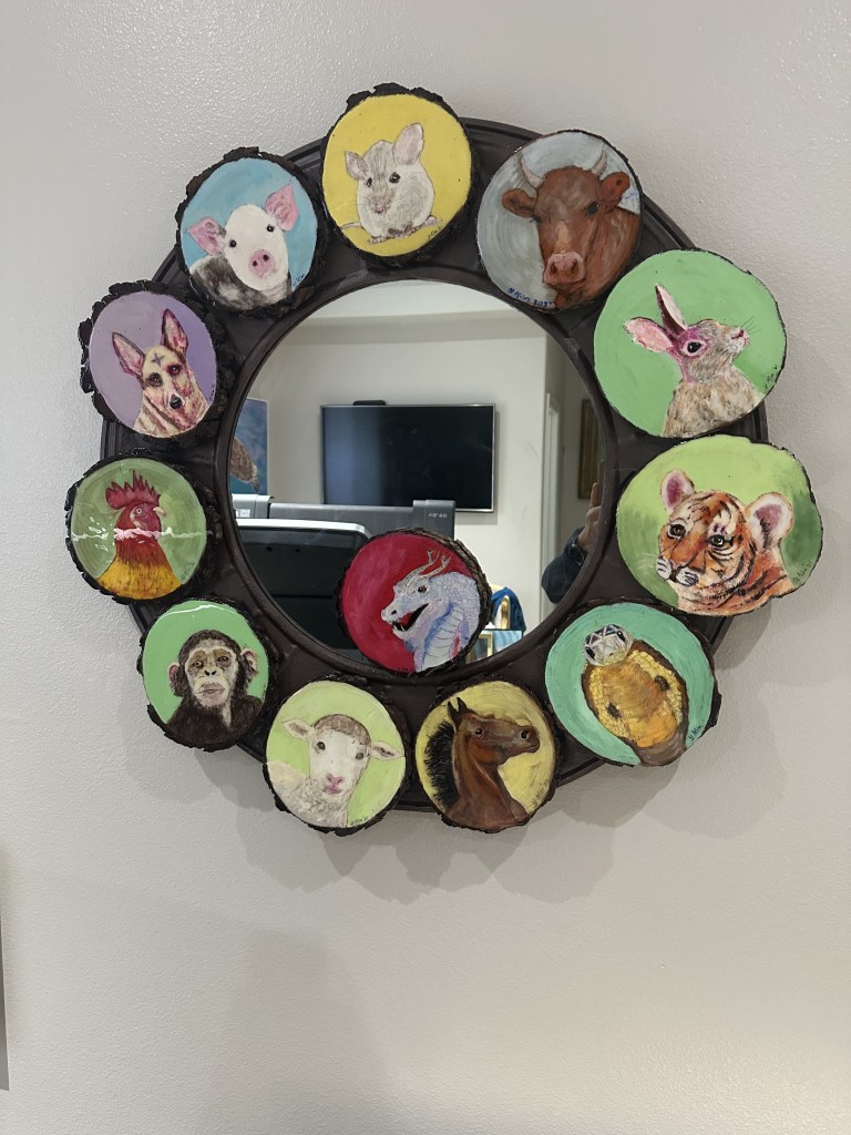 Zodiac Mirror 12x 8″ detachable wood panels, one in the middle represents animal of the year . For $1000 or more (overall dimension 33″ circle)